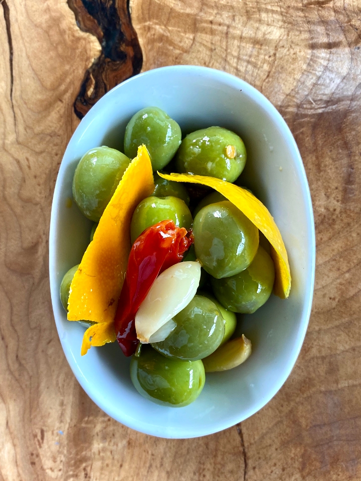 Marinated Castelvetrano Olives with Calabrian Chili, Citrus and Confit Garlic.