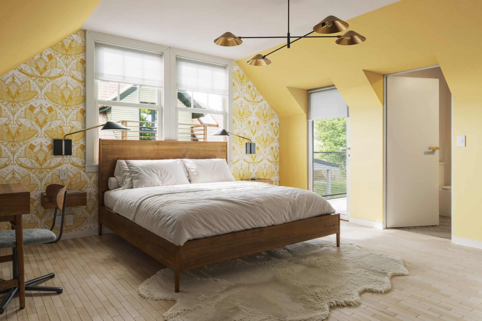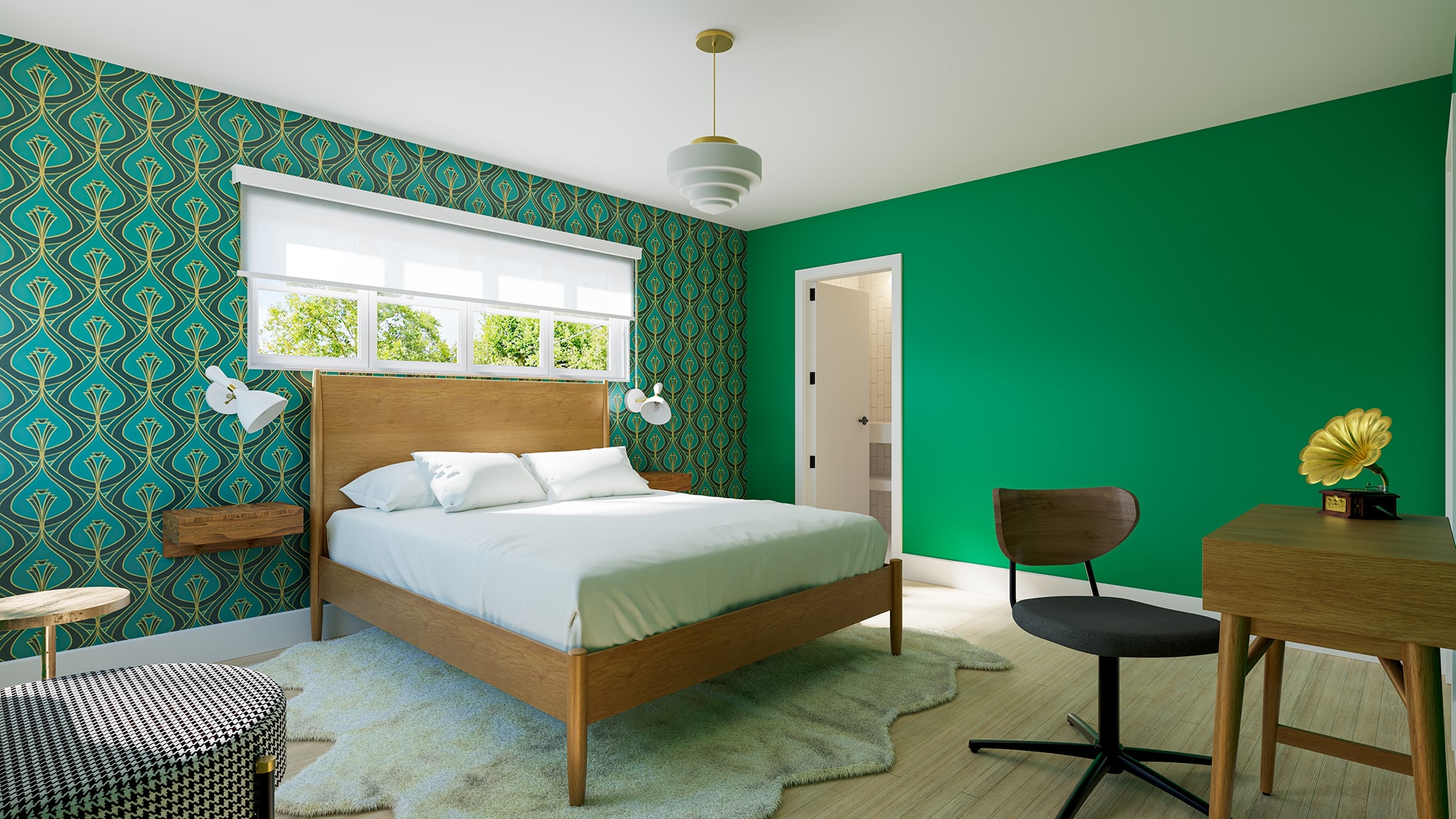 The Edison Room | 245 sq ft An energizing studio designed for up to two guests. It features a Luxury Queen Foam Mattress, excellent soundproofing, a private bathroom, dedicated workstation, clothing caddy, and a cozy sitting area. Vibrant green walls and golden geometric patterns bring a sense of creativity and motion, inspired by Thomas Edison’s flare for invention. The room is outfitted for the visually/hearing impaired.