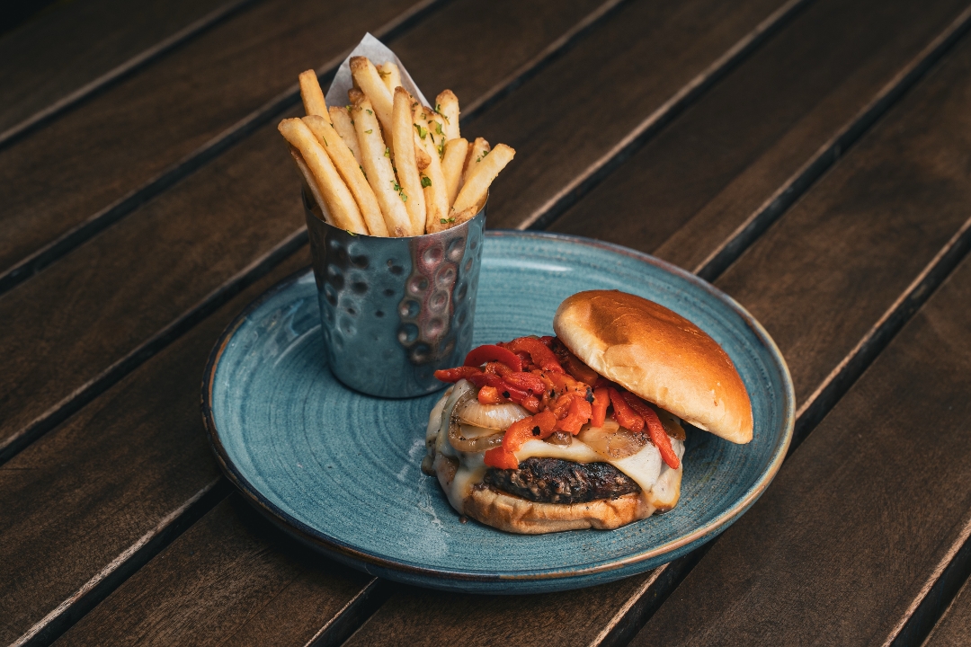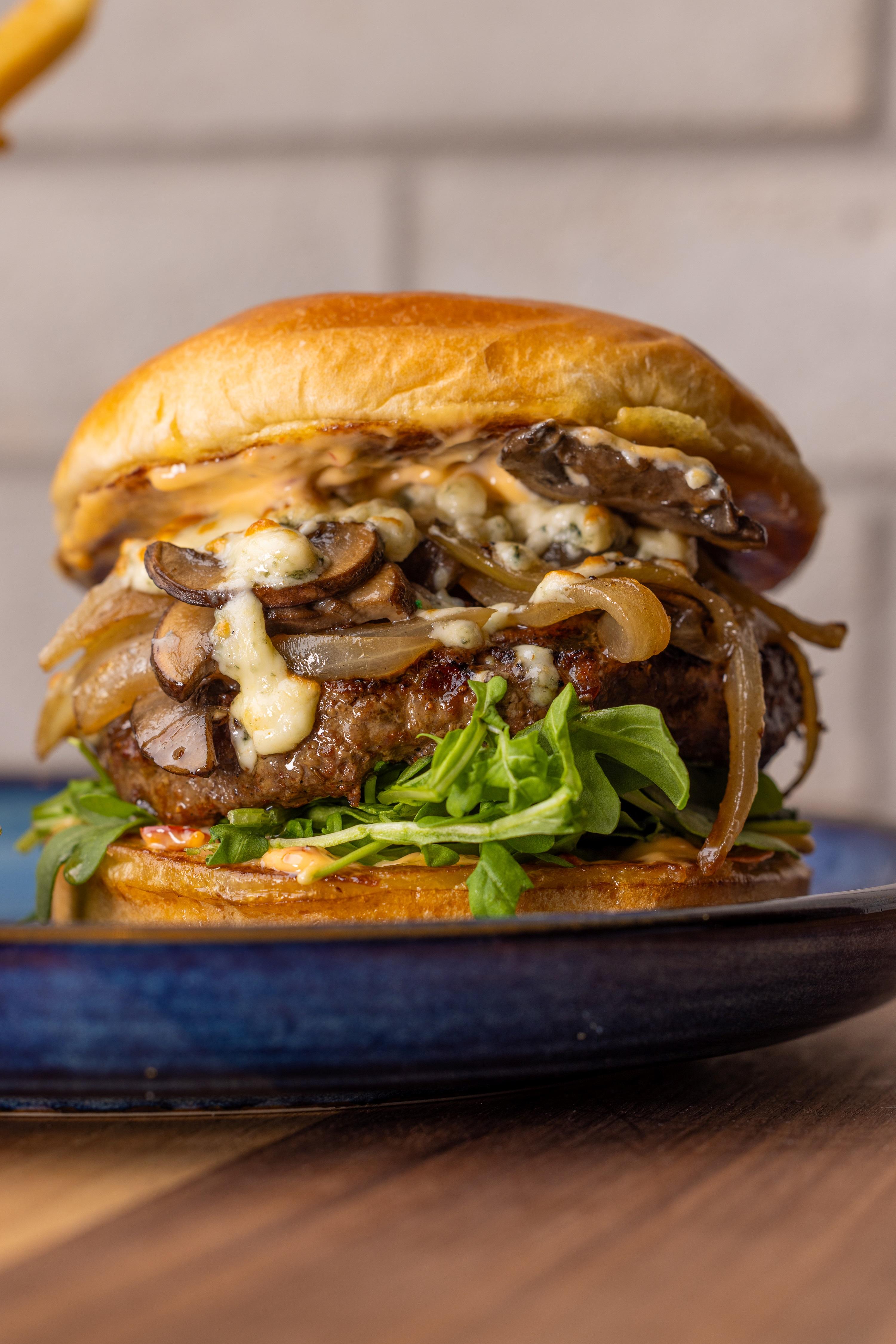 blue cheese / mushrooms / caramelized whiskey onions / arugula / Calabrian chili aioli / 1016 cal