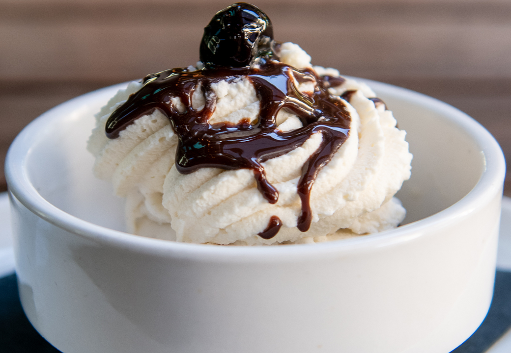 vanilla bean ice cream / chocolate sauce / bourbon maple whip / cherry