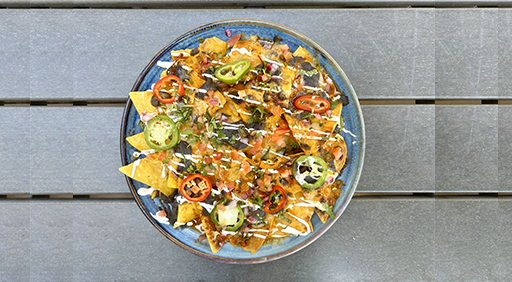 cheese blend / refried beans / chipotle sauce / crema / jalapeños / Fresno chiles / onions / tomatoes / cilantro / 807 cal