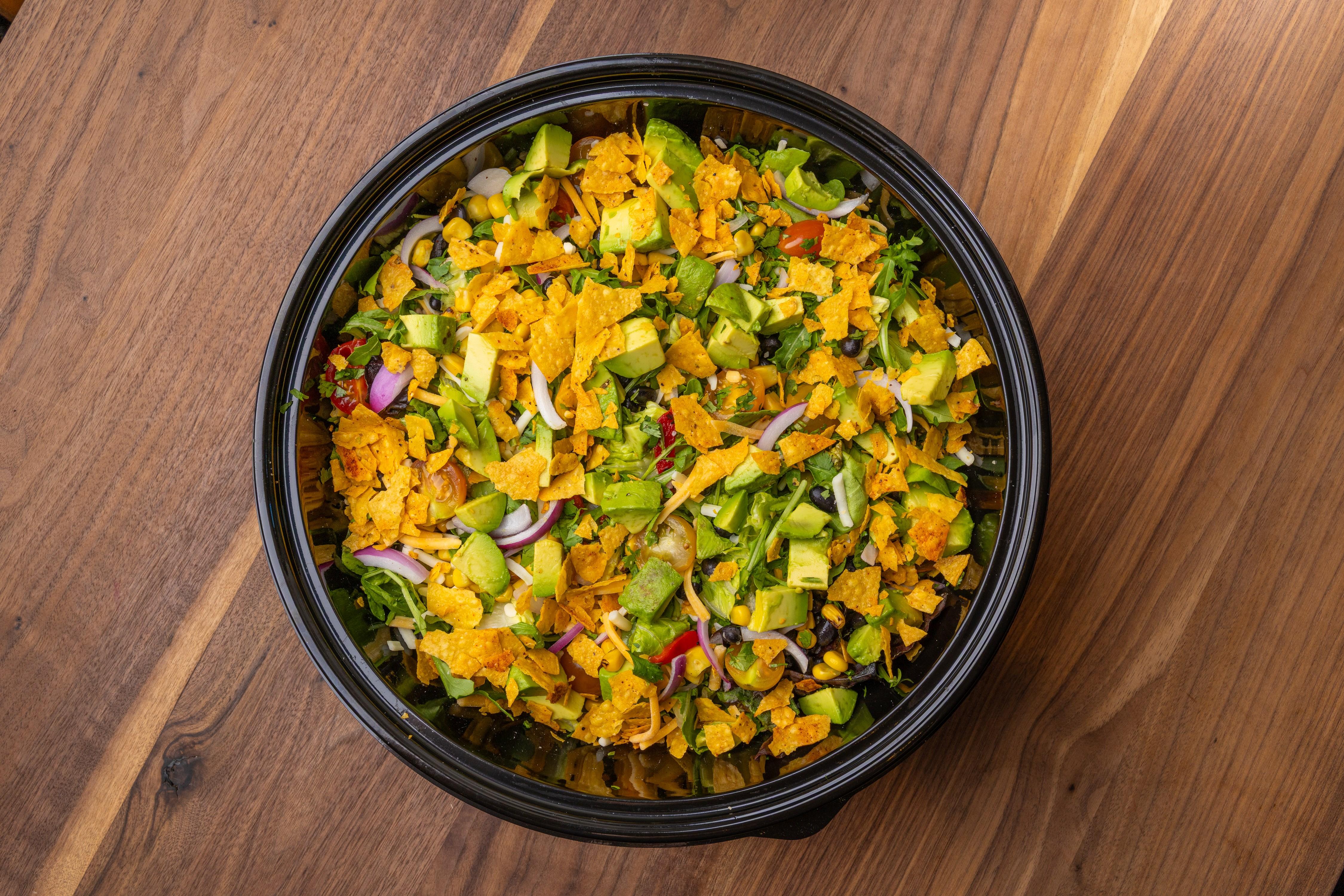 roasted corn / cherry tomato / black beans / red onion / cilantro / avocado / roasted red peppers / tortilla crumble / cheese mix / southwest dressing / 436 cal
