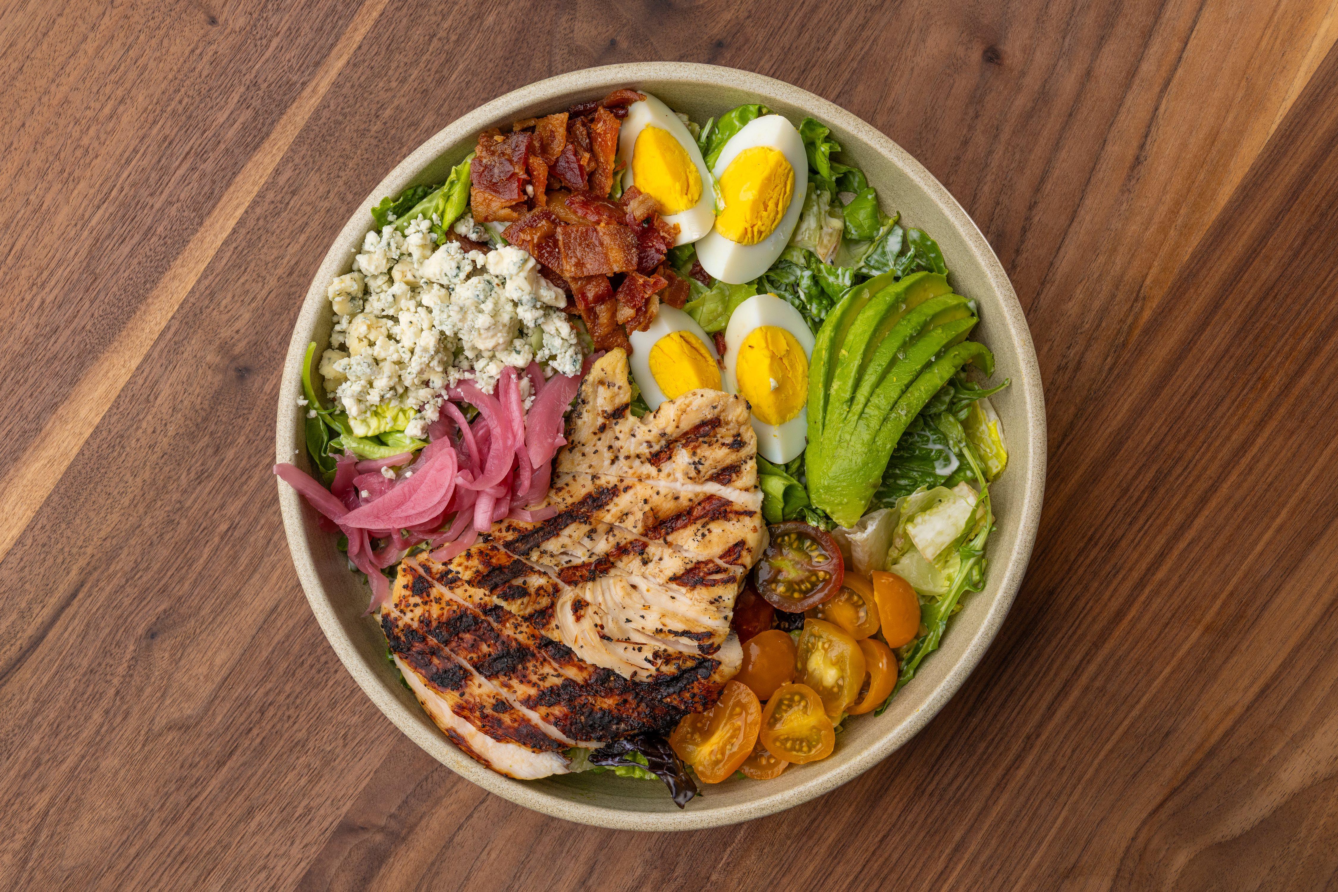 chicken / egg / avocado / tomato / pickled onion / blue cheese / bacon / ranch / 751 cal