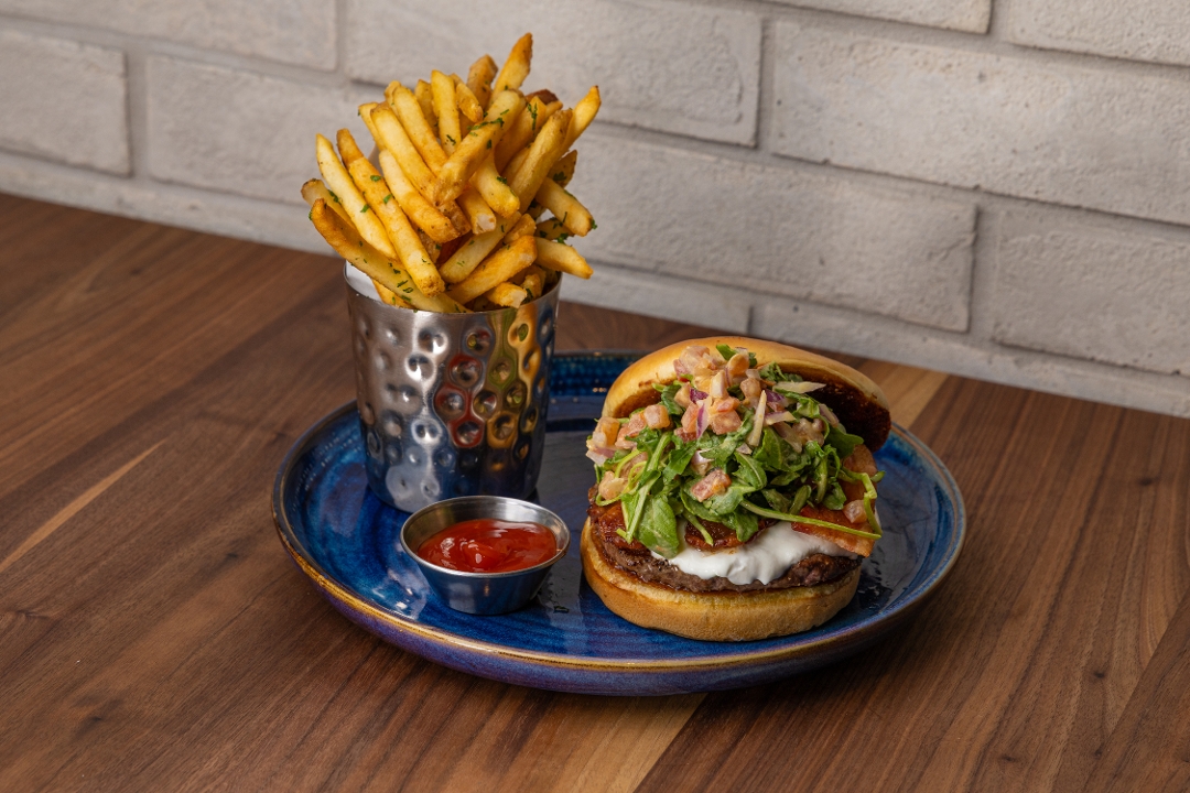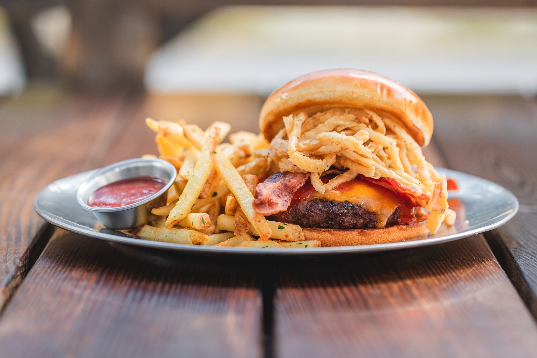 shoestring onions / bacon / cheddar / beer barbecue sauce / 1076 cal