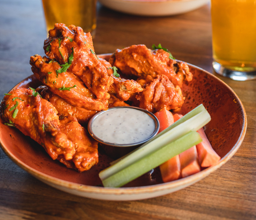 bone-in wings tossed in your choice of up to two flavors: orange chile glaze / firecracker / beer barbecue sauce / Calabrian chile sauce / Eureka! dry rub / 811-1066 cal