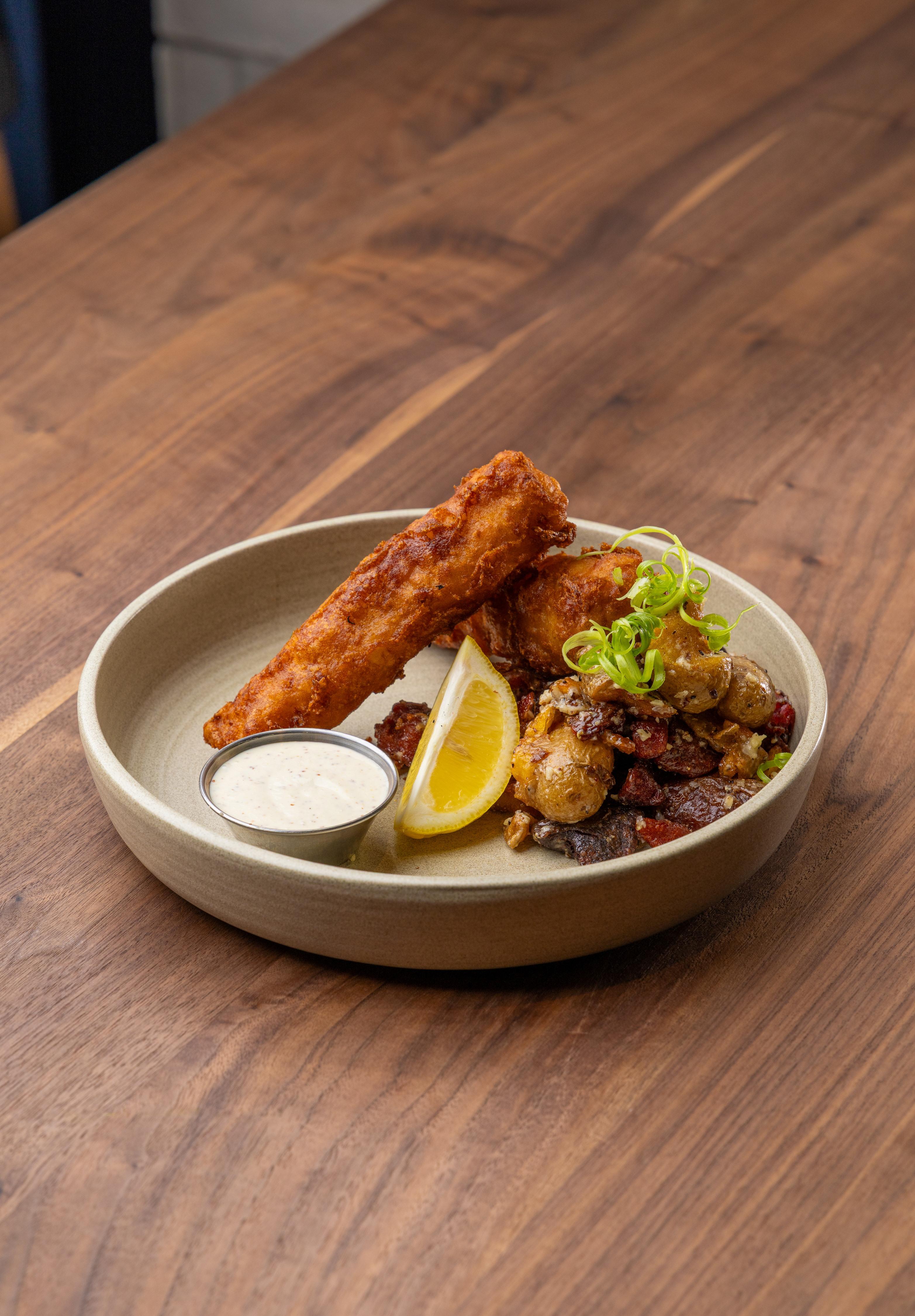 beer-battered cod / ripped fingerling potatoes / malt vinegar aioli / 1055 cal