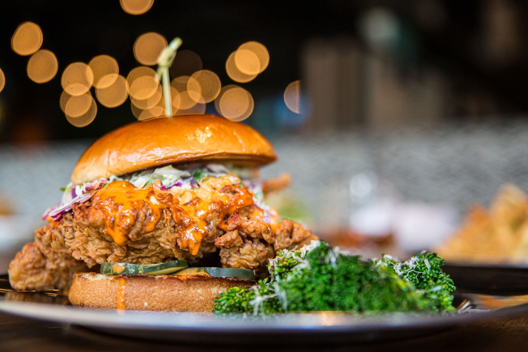 buttermilk breaded chicken / tangy coleslaw / dill pickles / firecracker aioli / 874 cal
