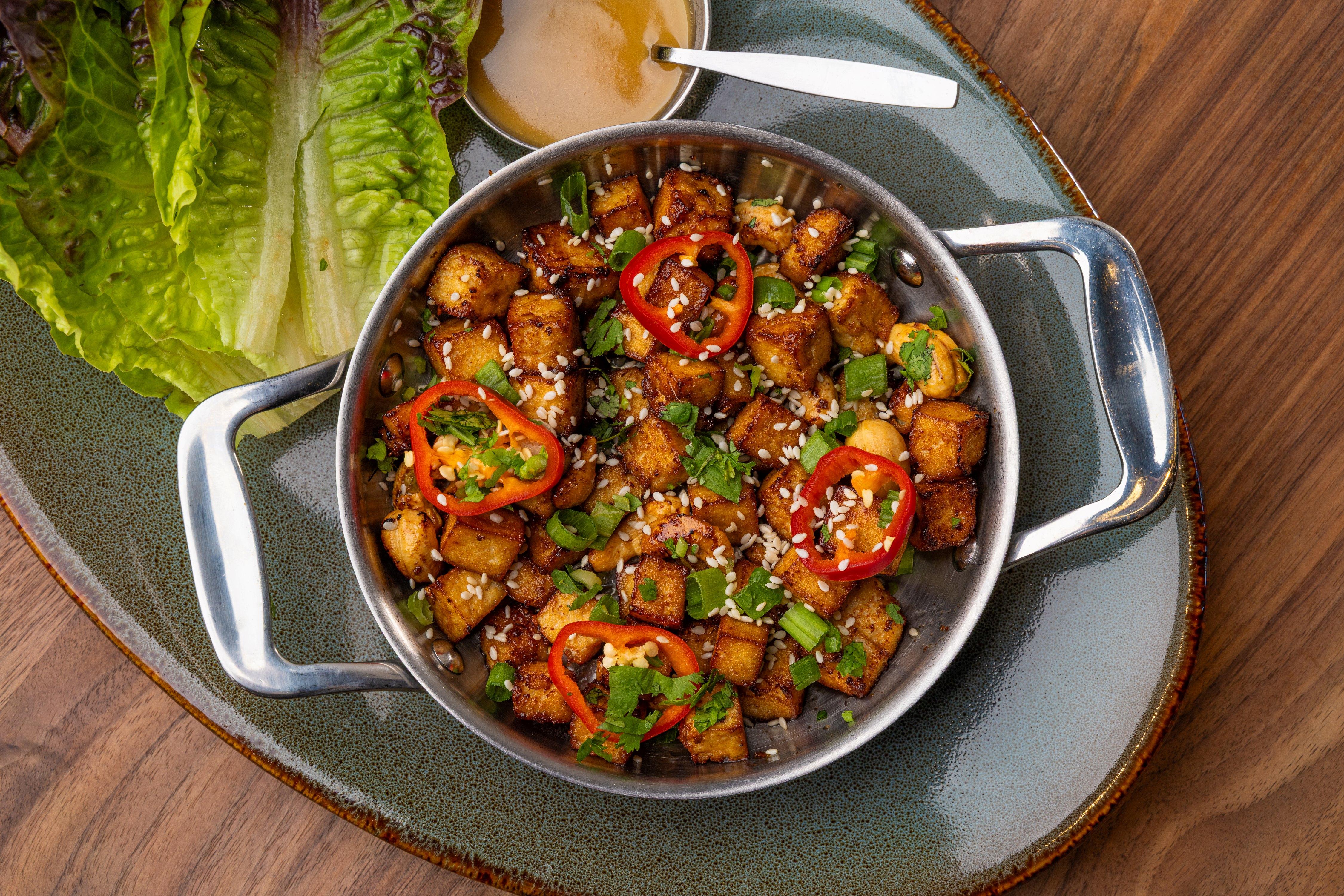 chicken or tofu / cashews / cabbage / carrots / green onions / Gochujang sauce / iceberg lettuce