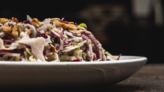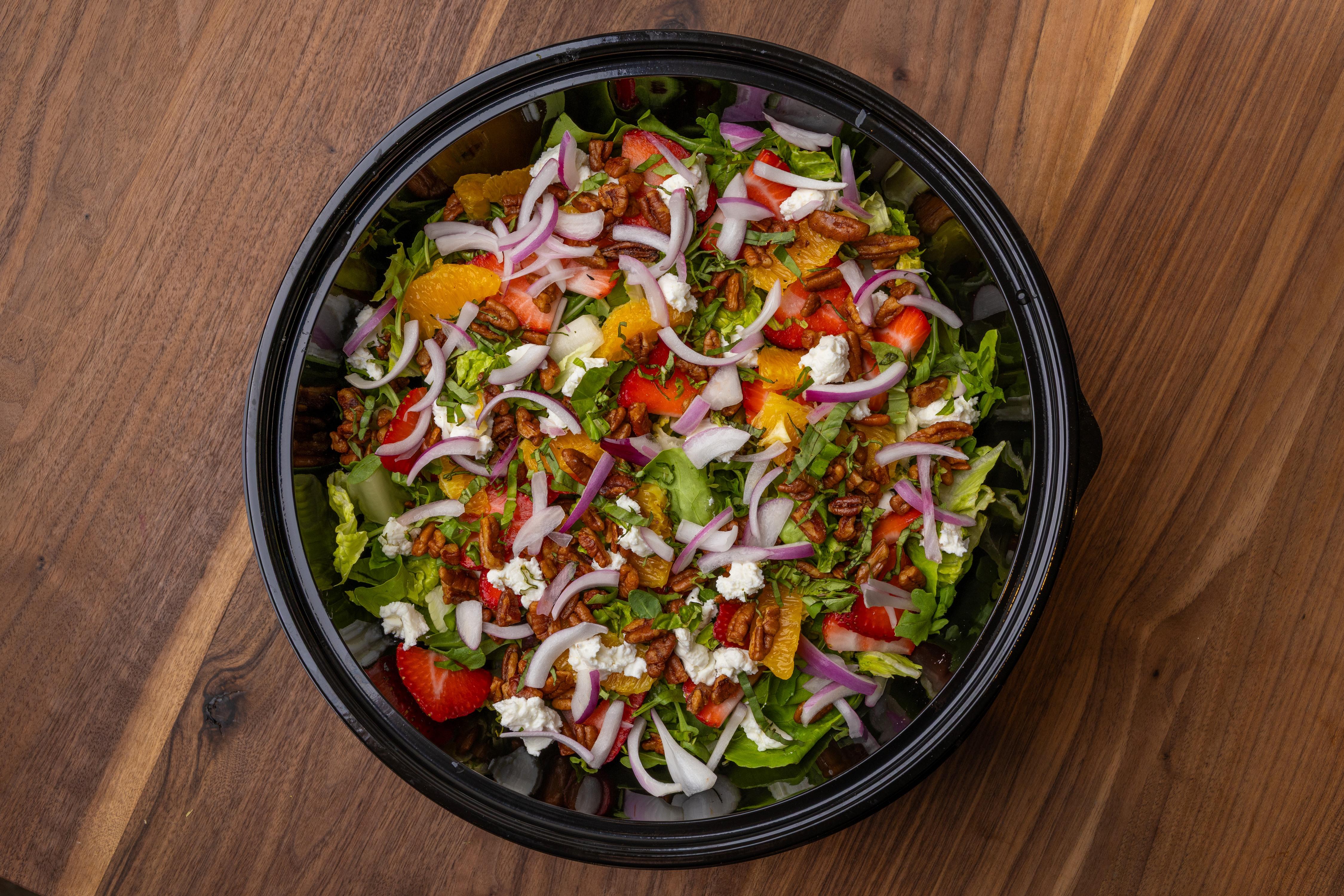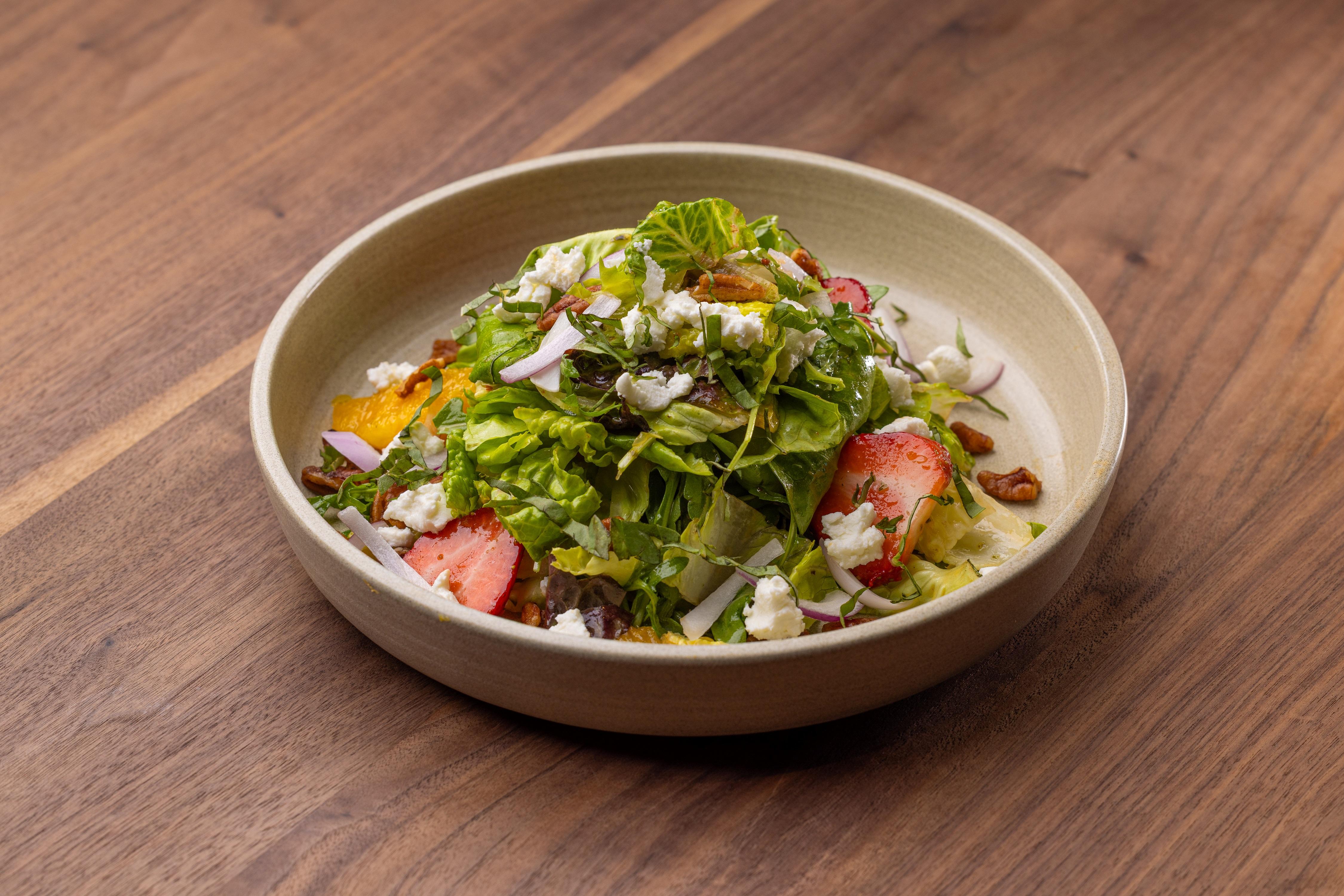 goat cheese / orange / strawberry / red onion / candied pecans / ripped basil / herb vinaigrette / 493 cal