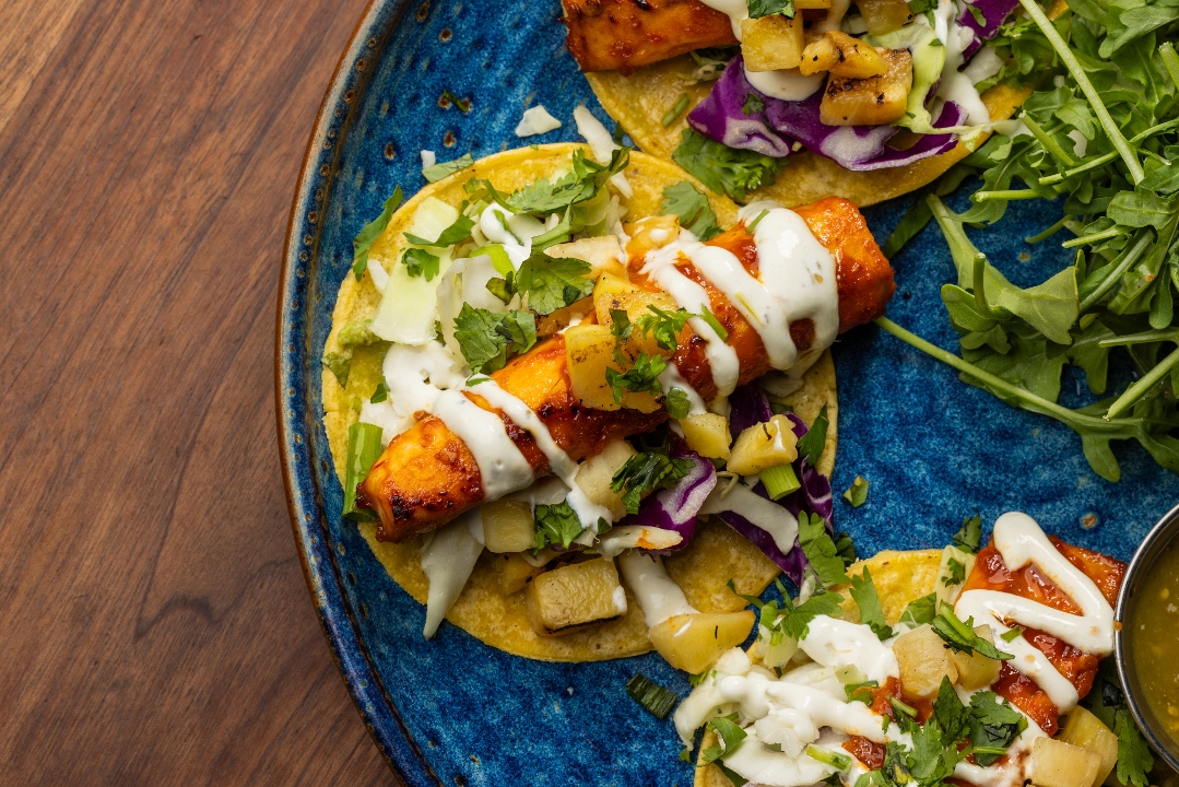 grilled cod / pineapple / cabbage / green onions / cilantro / crema / guacamole / 492 cal