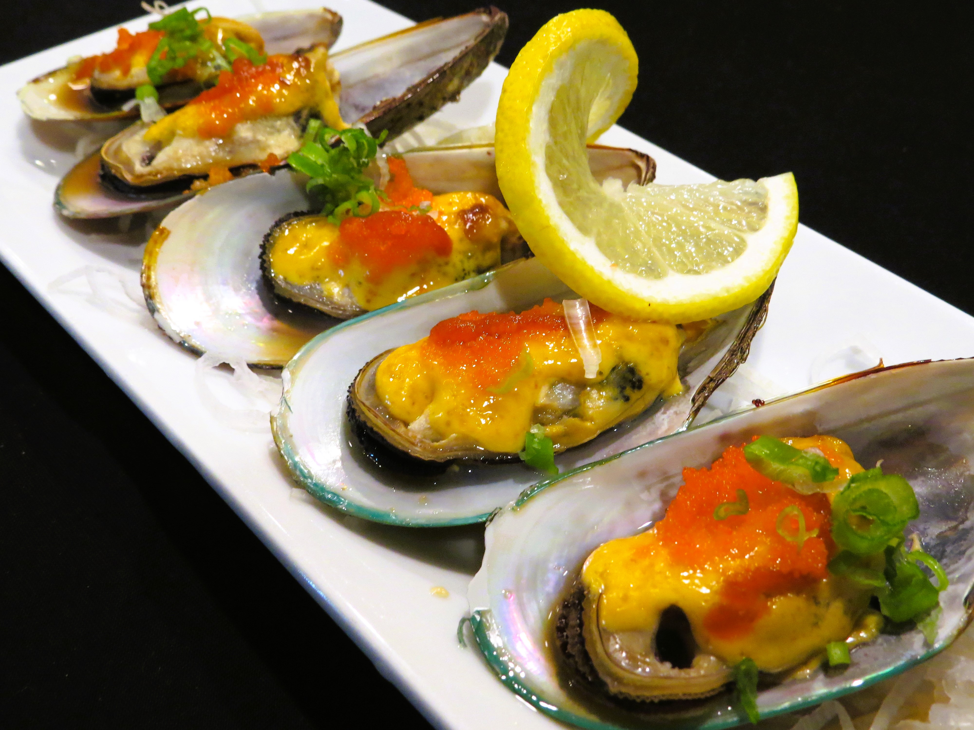 Baked green mussels (5 pc.) topped with masago, green onion, sriracha, ponzu sauce & spicy mayo