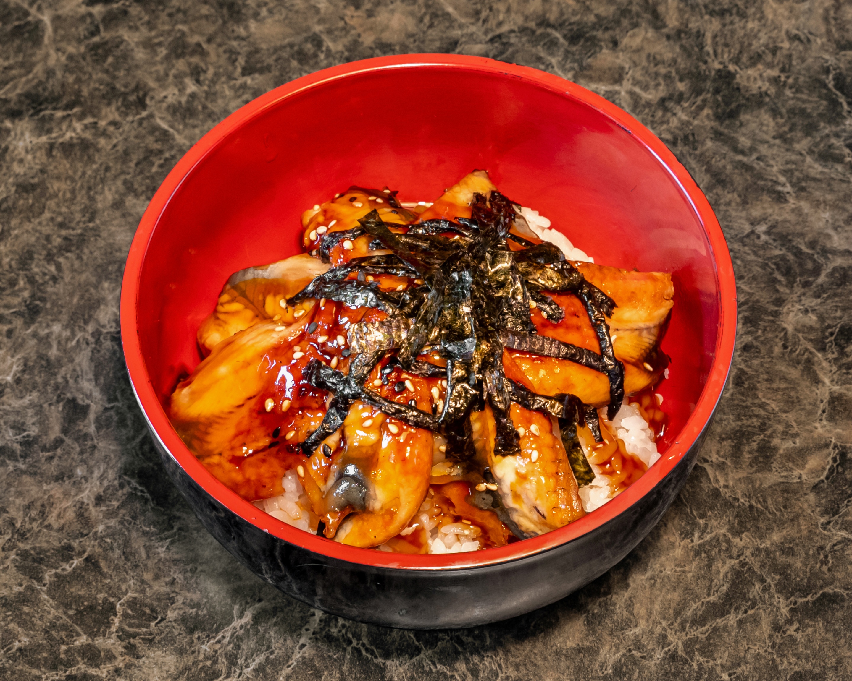 Barbecued freshwater eel slices glazed in eel sauce and served over a bed of steamed rice; topped with dried seaweed strips