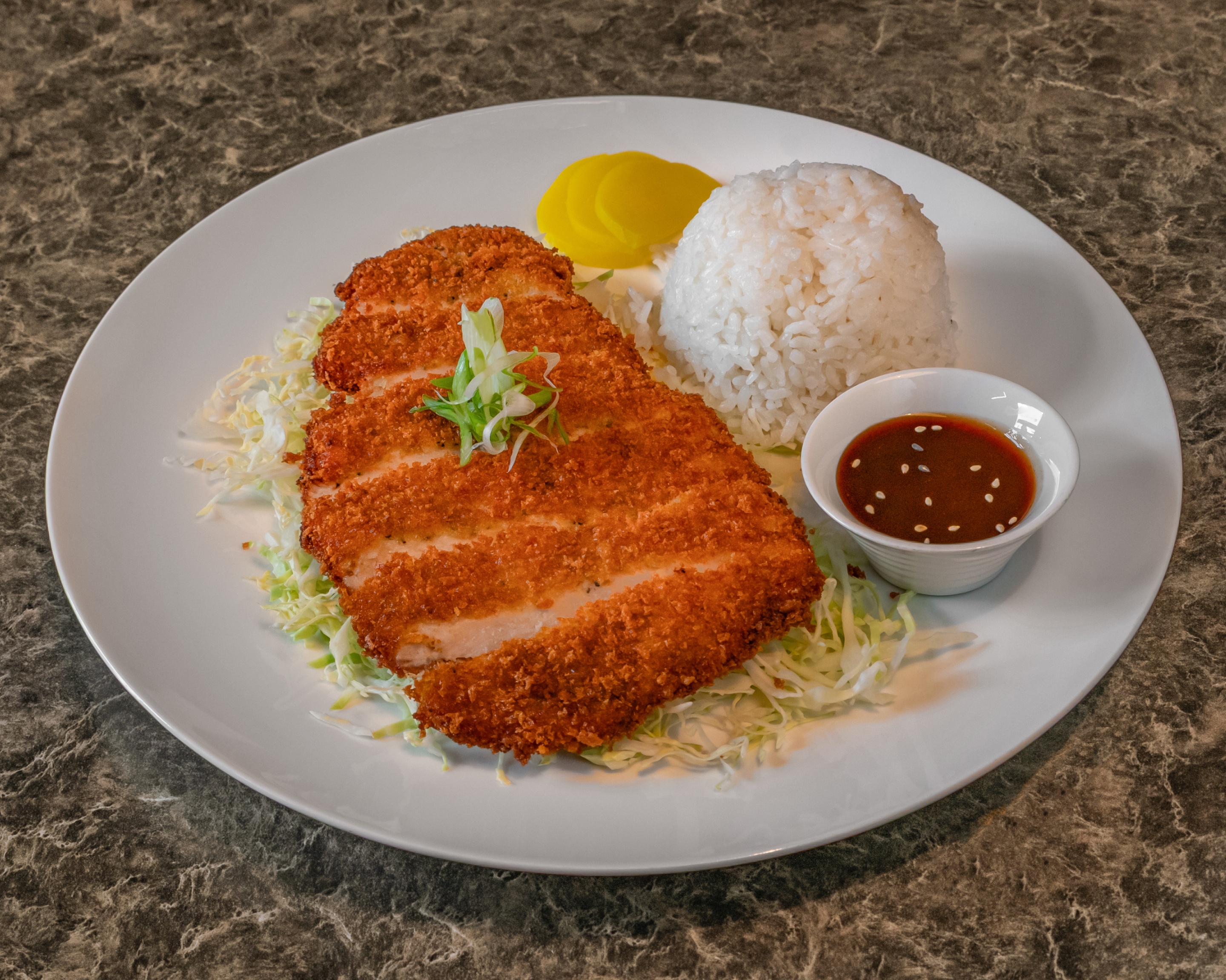 Crispy panko-crusted pork cutlet served with pickled daikon and our sweet and tangy katsu sauce