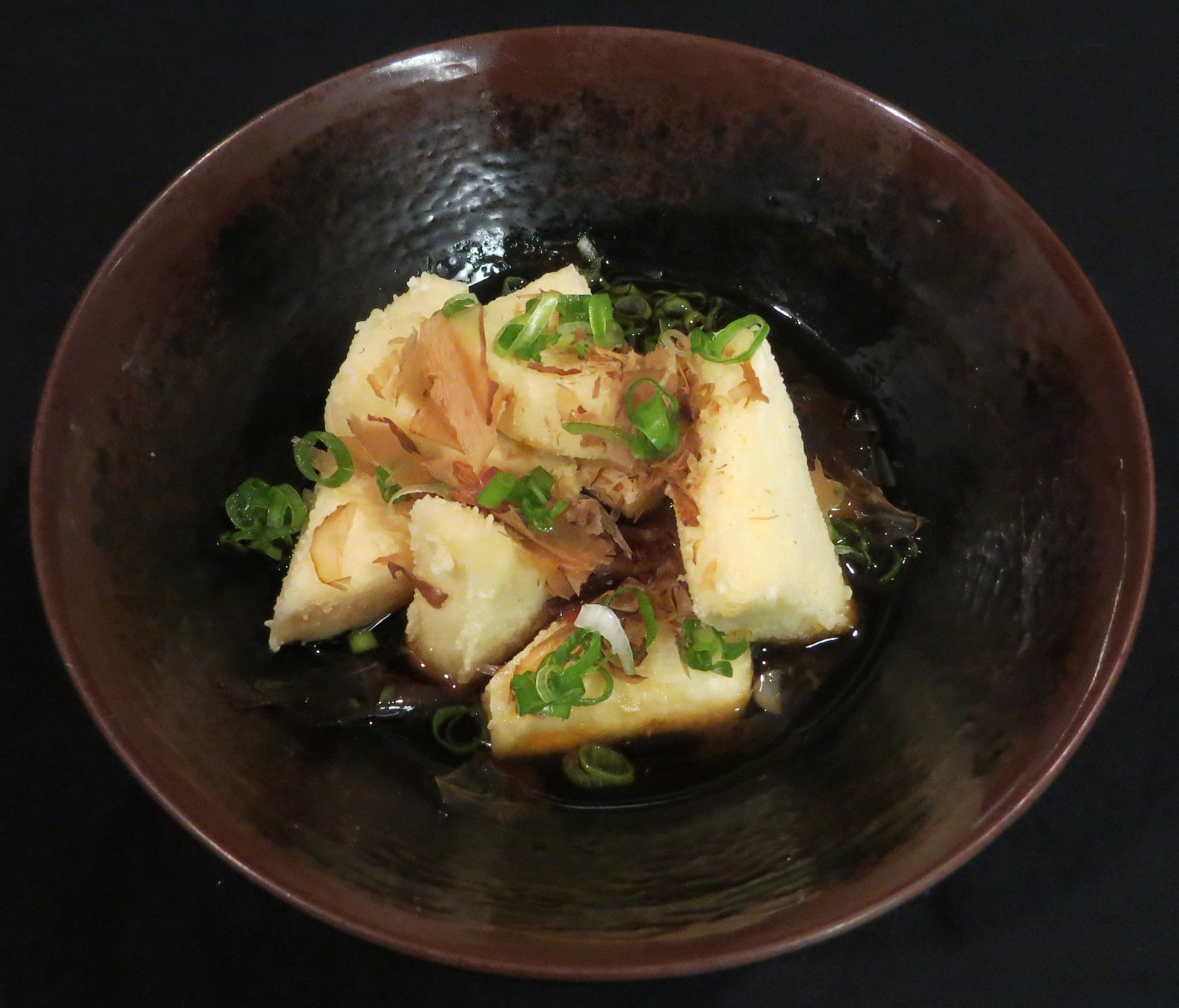 Lightly fried tofu slices with bonito flakes, green onion and our savory tempura sauce