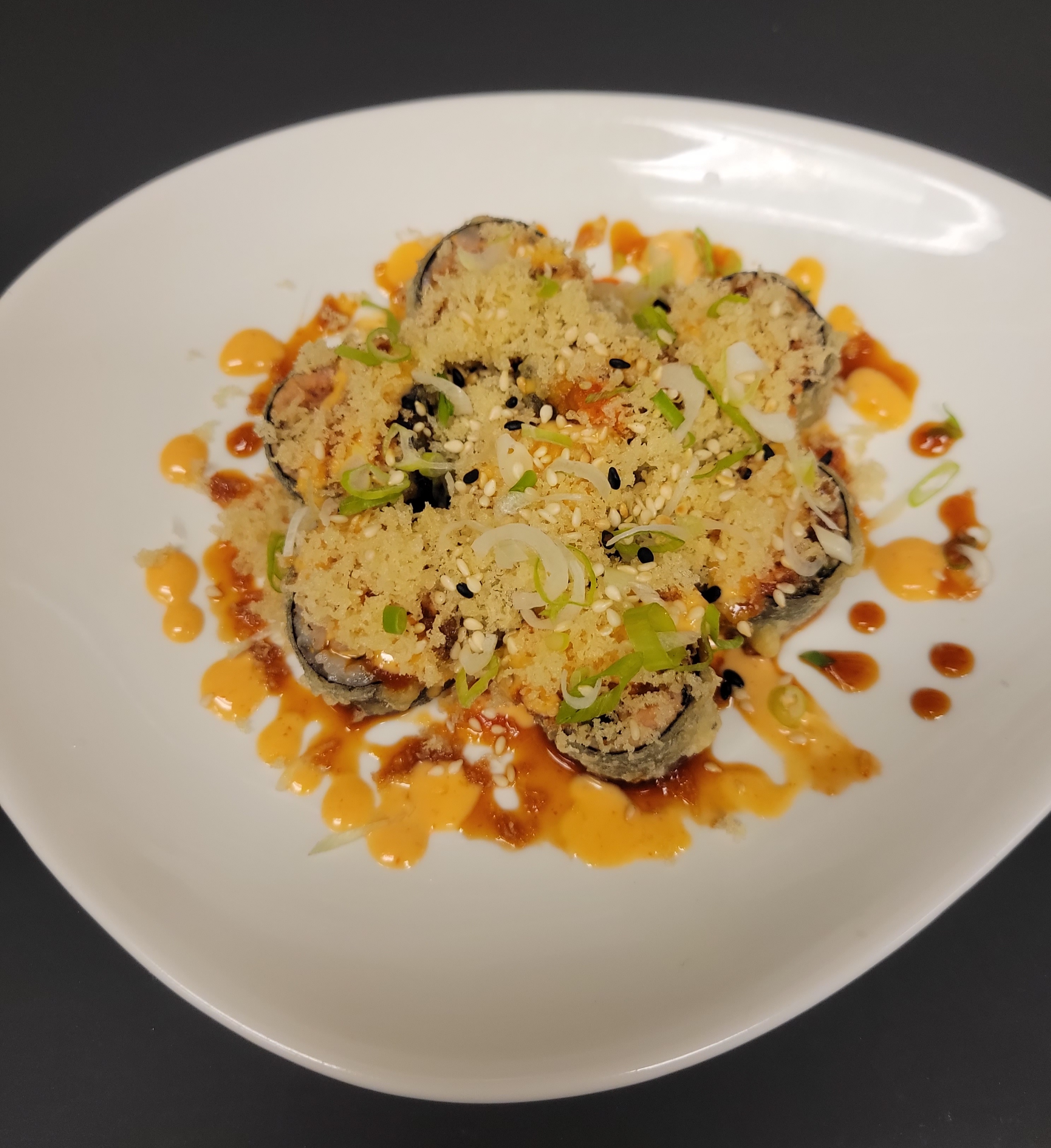 Spicy tuna, cilantro, shiso leaves, jalapeno, wrapped in nori and tempura-fried; sauced with our blend of house sauces and topped with crunchy tempura flakes