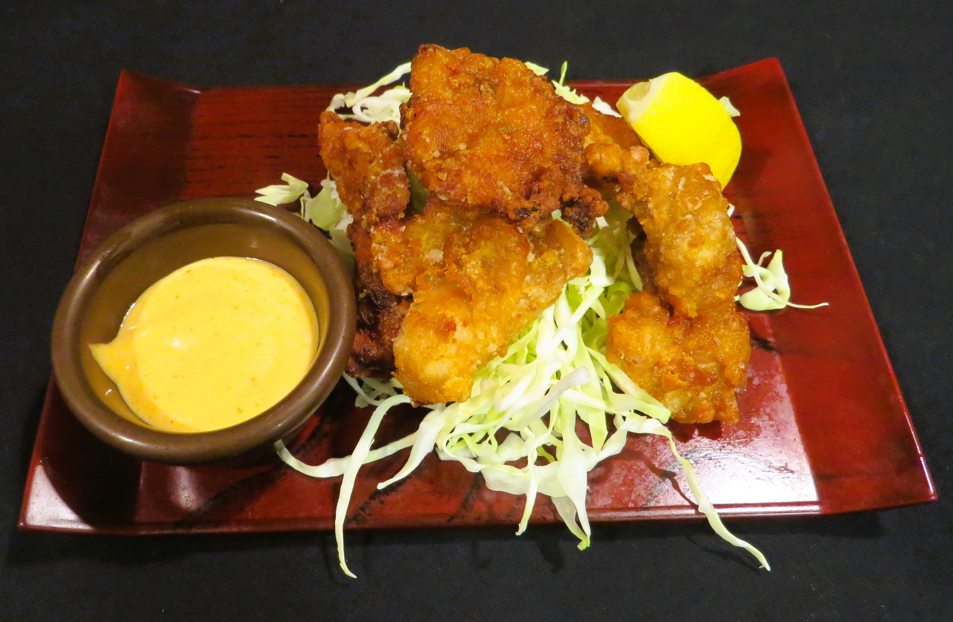 Japanese fried chicken made from chicken pieces marinated in our homemade Asian ginger marinade; served with lemon slice and spicy mayo