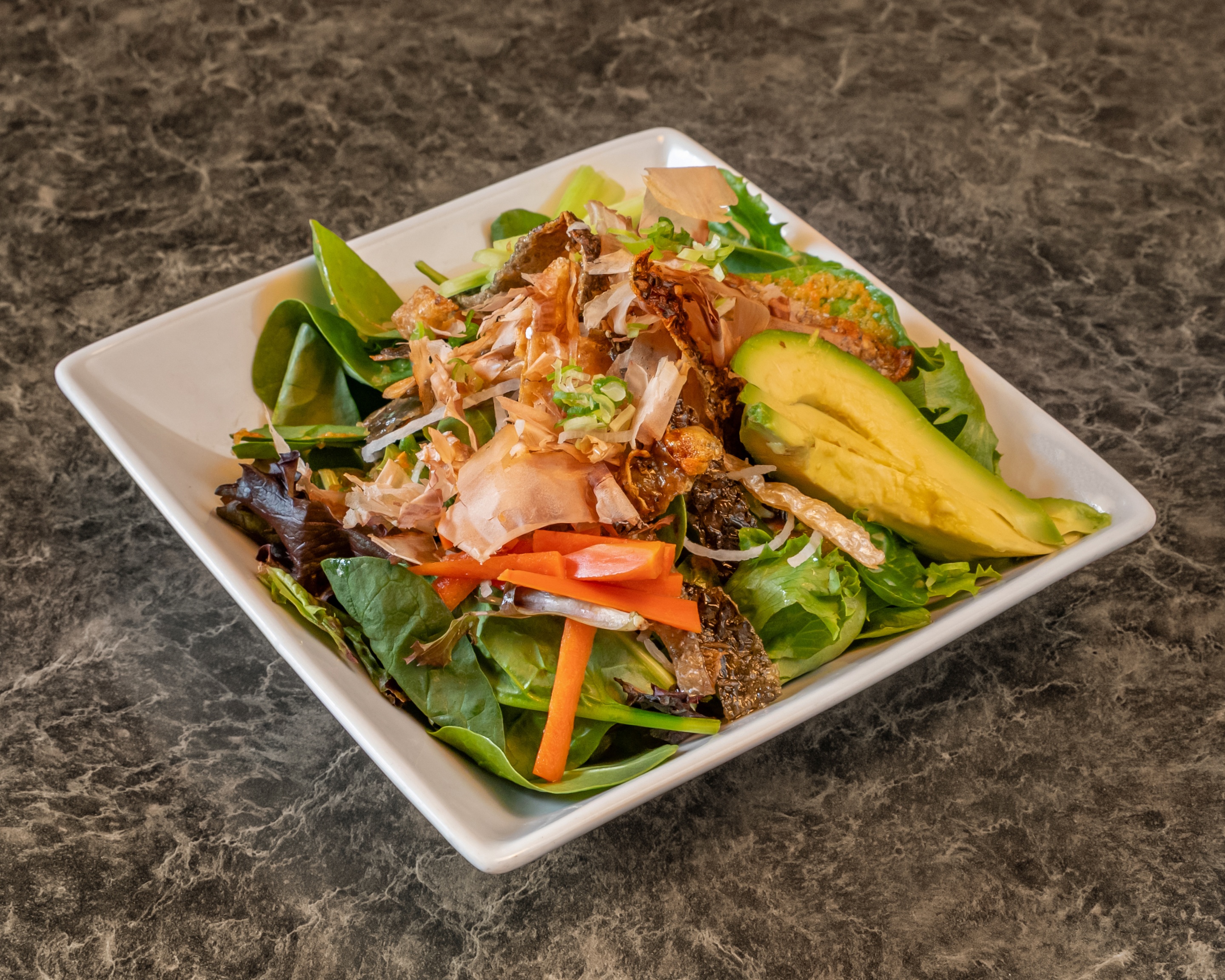 Crispy salmon skin served on a bed of spring mix, gobo, green onion & bonito flakes; served with house dressing