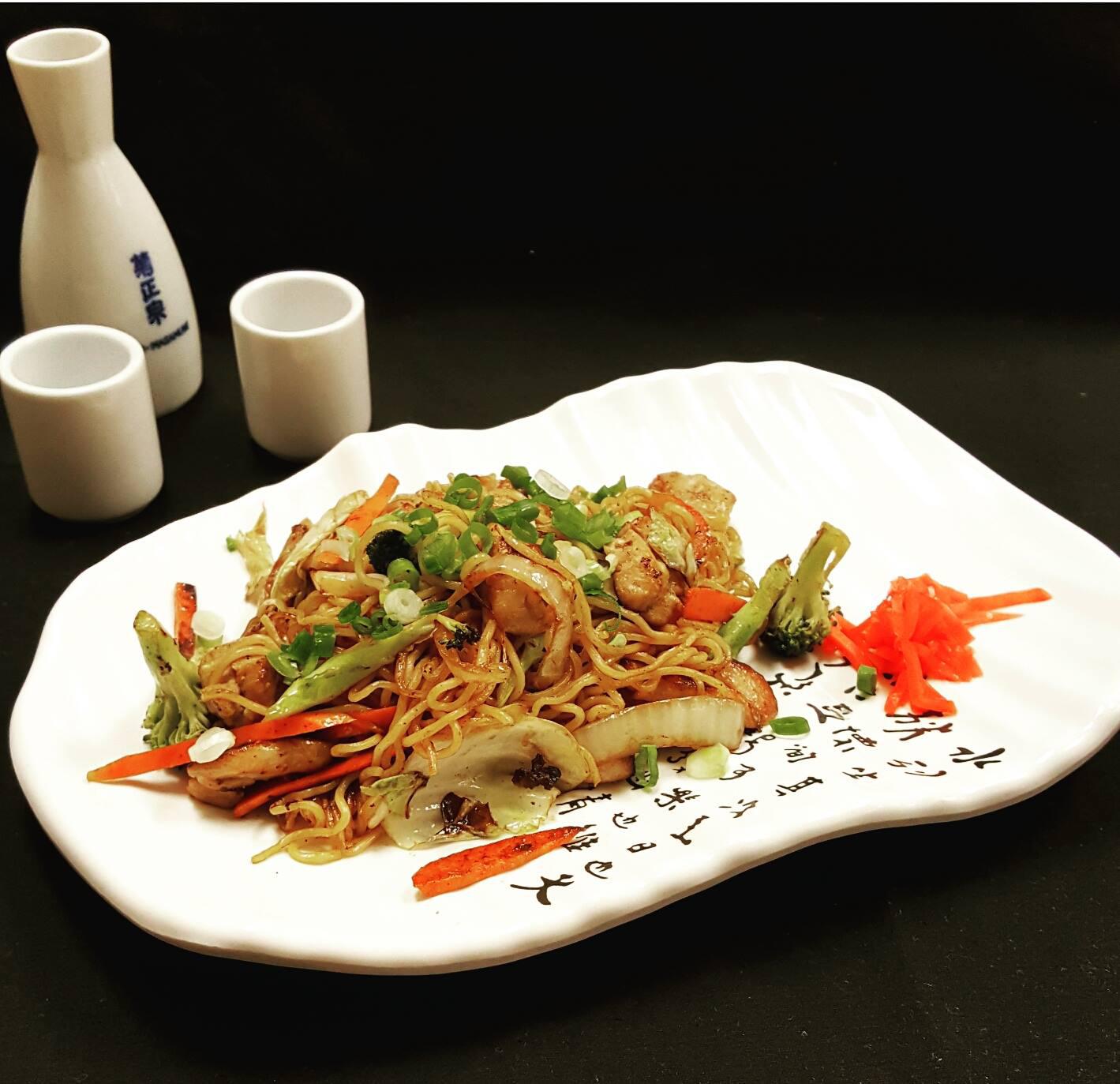 Stir-fried thin noodles in a sweet and savory yakisoba sauce with assorted vegetables and your choice of protein